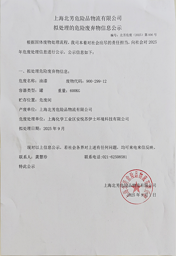 上海北芳危险品物流有限公司拟处理危险废物的信息公示2025006