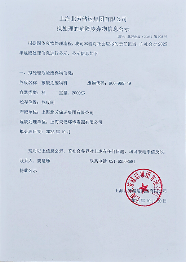 上海北芳储运集团有限公司拟处理危险废物的信息公示2025008