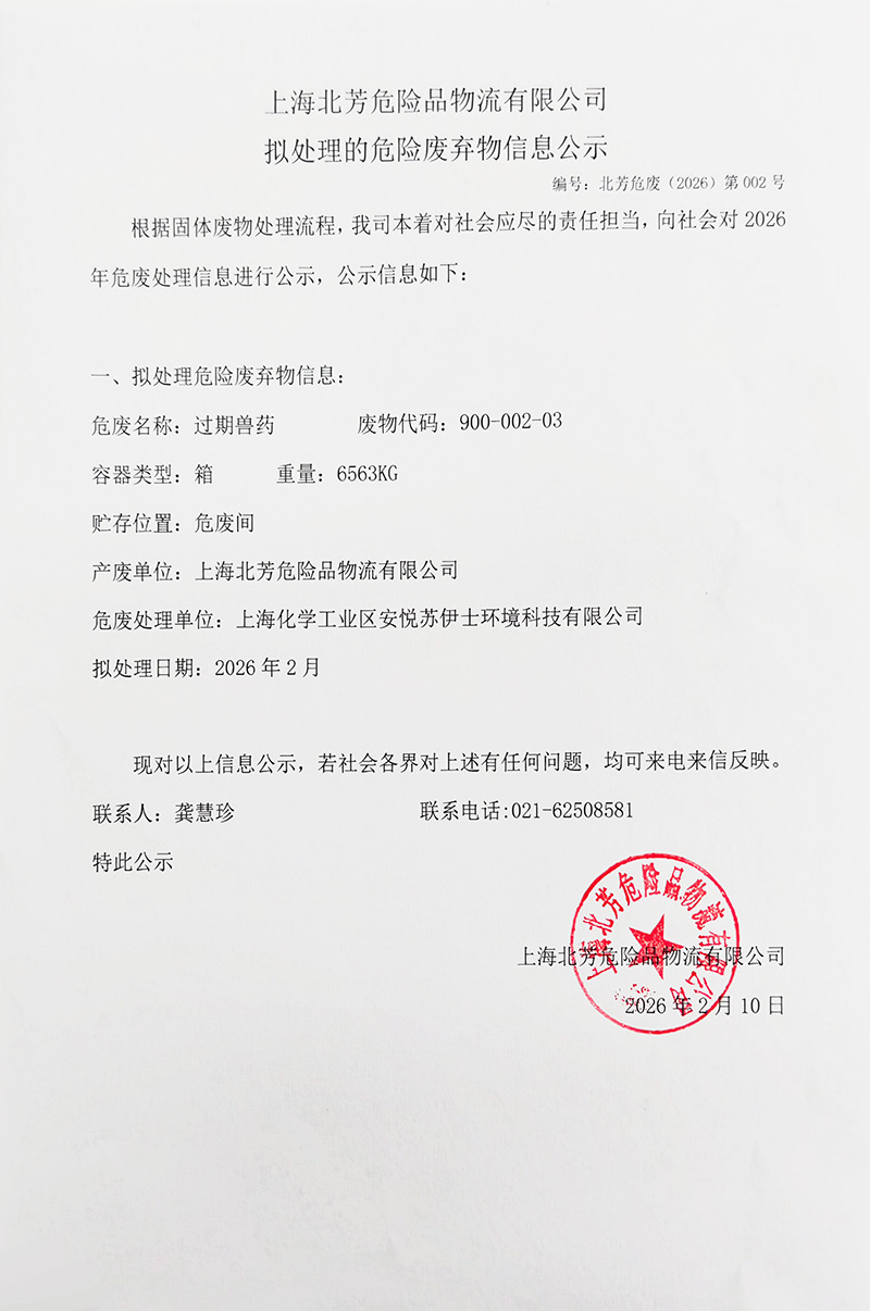 上海北芳危险品物流有限公司拟处理危险废物的信息公示2026002