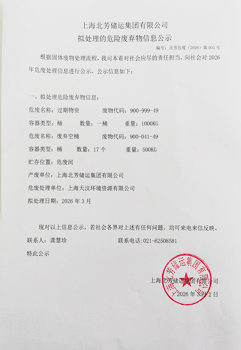 上海北芳储运集团有限公司拟处理危险废物的信息公示2026003